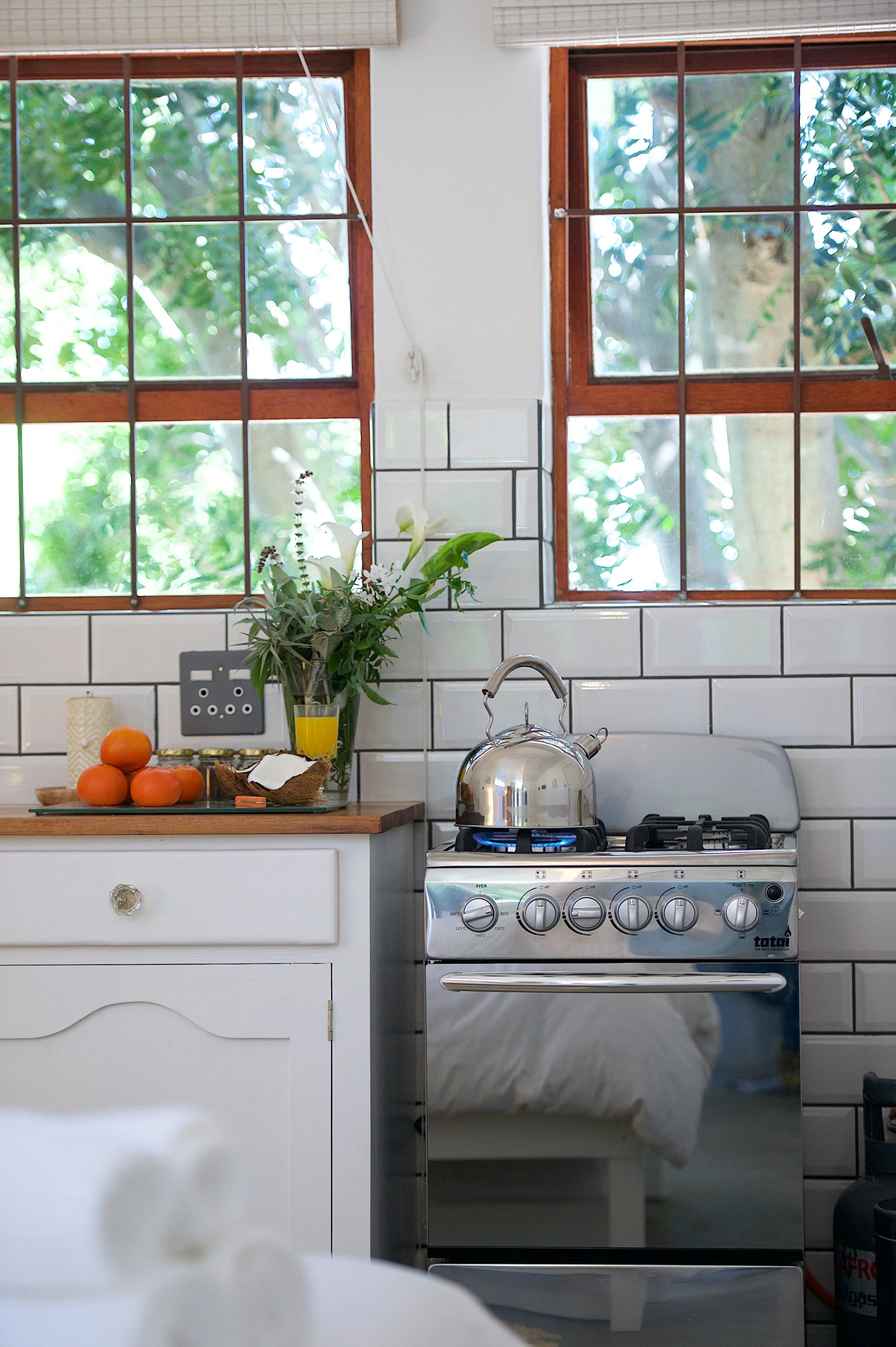 Our restored retro styled Honeysuckle Cottage is fully equipped self catering with an open plan kitchen and living-room with TV and dining room table and has large sliding doors, leading to an extensive patio with a private garden and barbecue facility, providing a calming feeling where guinea fowl wake you up and owls put you to sleep.